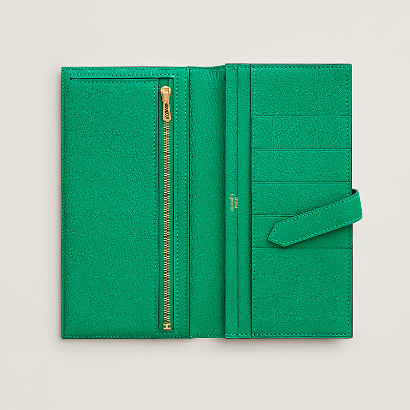 Brieftasche mit Einschubfach aus Mysore-Ziegenleder, Futter aus Lammleder, Verschluss durch Lederriemen und vergoldete "H"-Schließe
