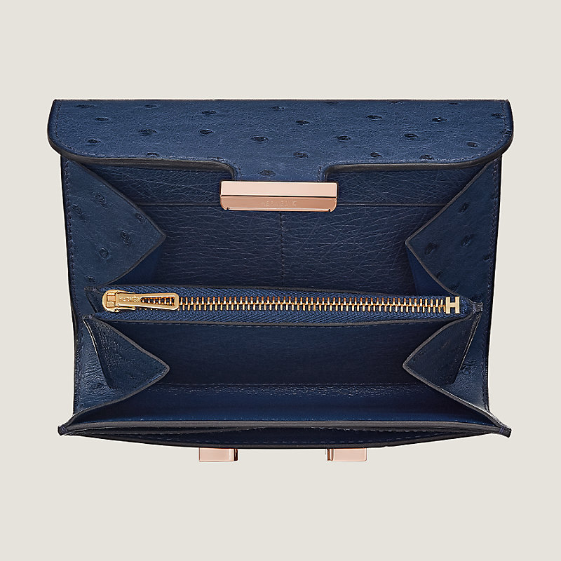 Kompakte Brieftasche aus Straußenleder, rosévergoldeter Schmuck