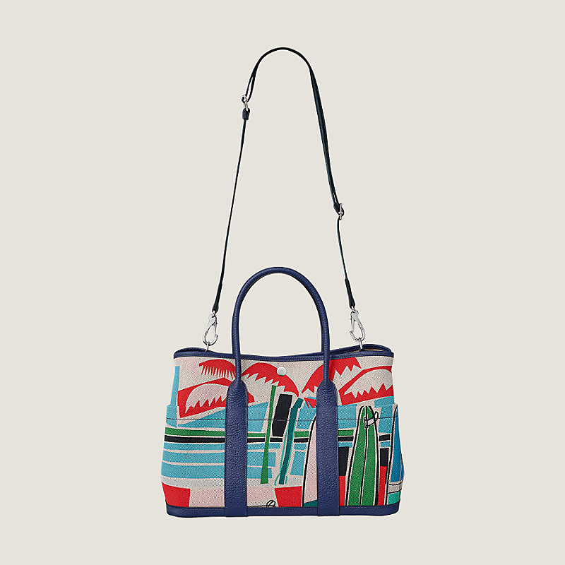 Tasche aus Country-Rindsleder, H-Stofffutter mit "Sea, Surf & Fun"-Print, Schmuck mit Silber- und Palladiumauflage, Innentasche mit Reißverschluss