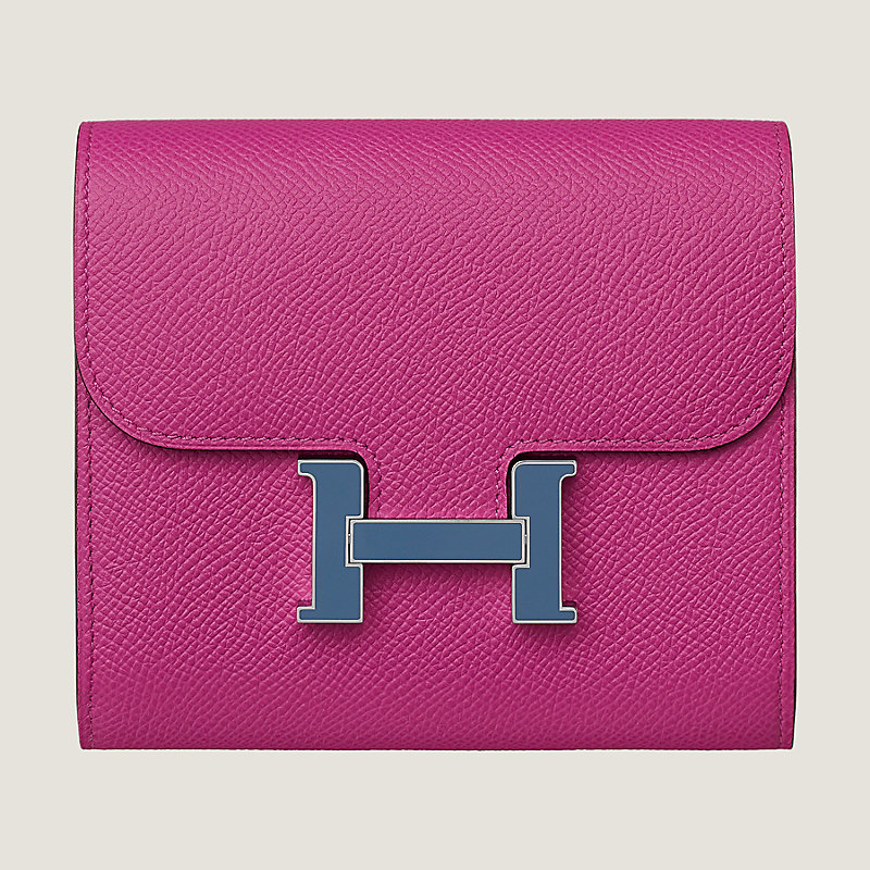 Compact wallet in Epsom calfskin with 4 credit card slots, 2 pockets, zipped change purse, external pocket and lacquered palladium plated 'H' tab closure