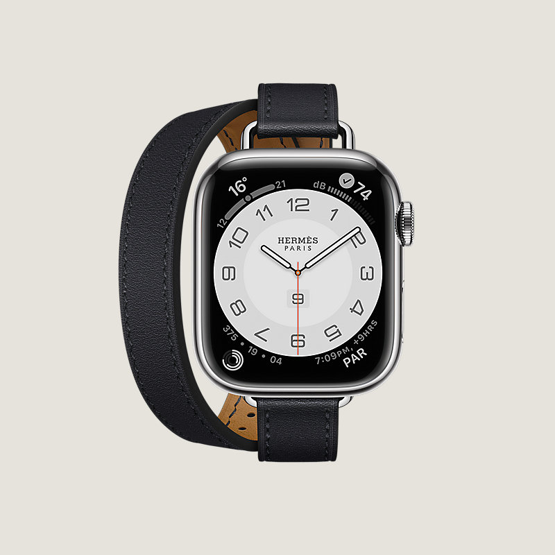 Apple Watch Hermes Series 7 case in stainless steel 41 mm & Double tour band in Bleu Indigo Swift calfskin