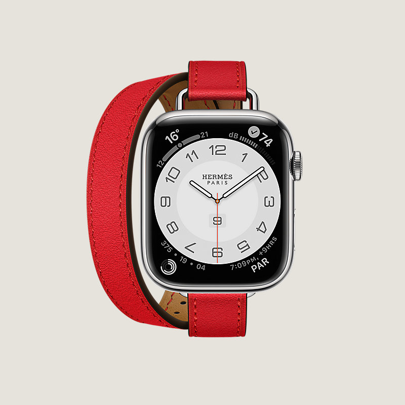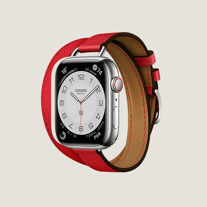 Apple Watch Hermes Series 7 case in stainless steel 45 mm & Double tour band in Rouge de Cœur Swift calfskin