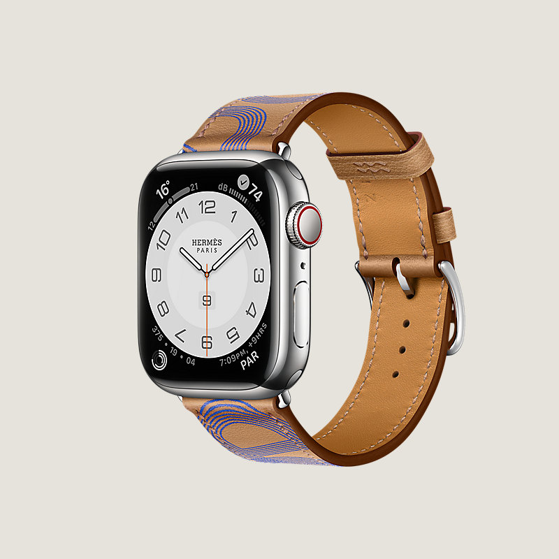 Apple Watch Hermes Series 7 case in stainless steel 41 mm & Single tour band in Biscuit/Bleu Electrique Swift calfskin, "Circuit 24" print