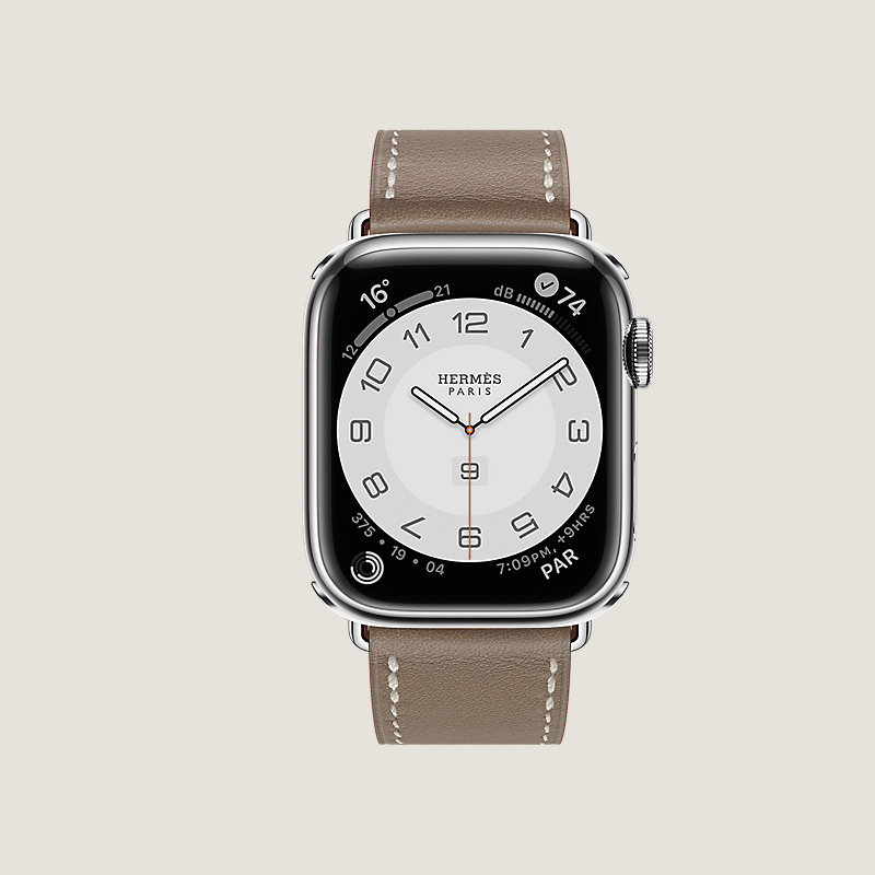 Apple Watch Hermes Series 7 case in stainless steel 41 mm & Single tour band in Etoupe Swift calfskin