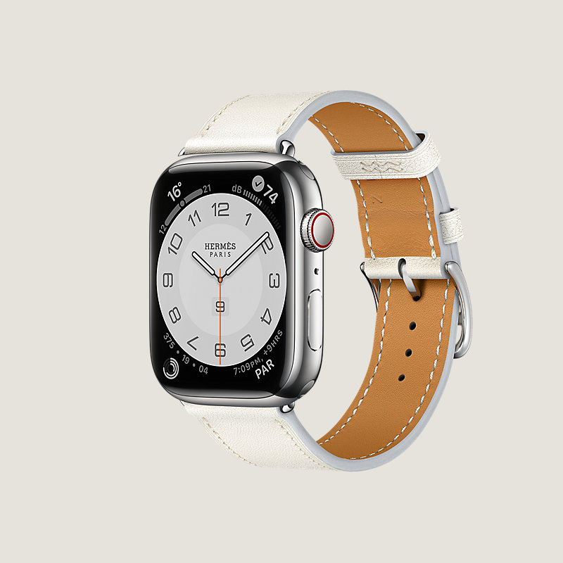 Apple Watch Hermes Series 7 case in stainless steel 45 mm & Single tour band in Blanc Swift calfskin