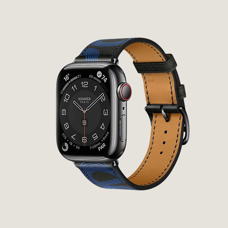 Apple Watch Hermes Series 7 case in space black stainless steel 41 mm & Single tour band in Noir/Bleu Electrique Swift calfskin, "Circuit 24" print