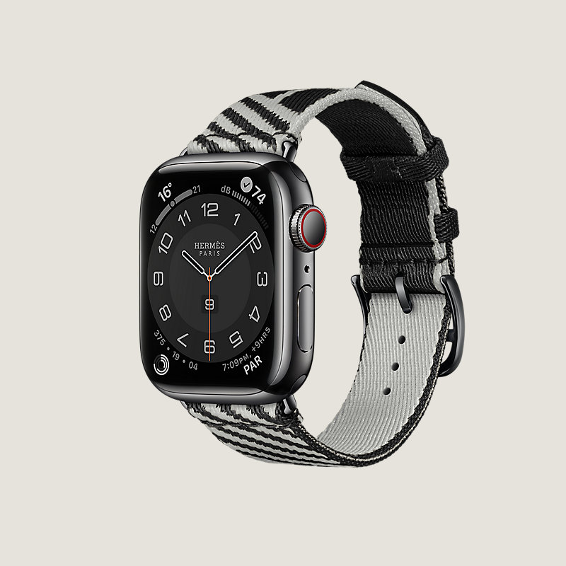 Apple Watch Hermes Series 7 case in space black stainless steel 41 mm & Single tour band in Noir/Gris Clair nylon weave, "H Vibration" motif