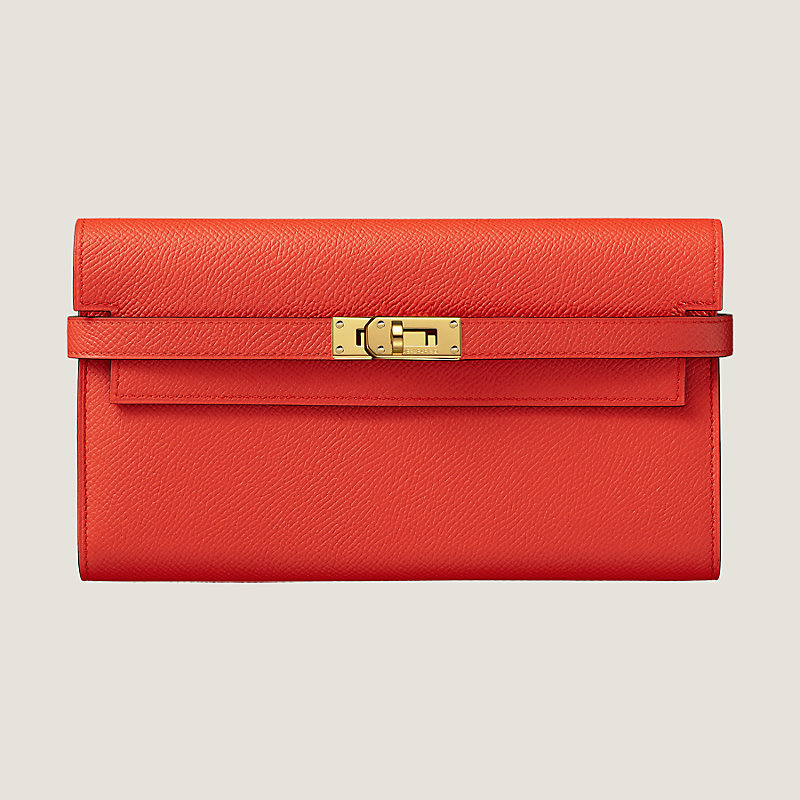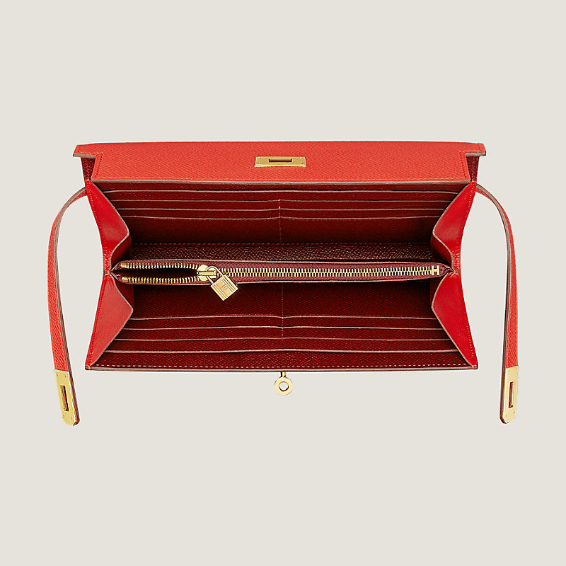 Long wallet in Epsom calfskin with 12 credit card slots, 2 bill pockets, zipped change purse and gold plated Kelly closure