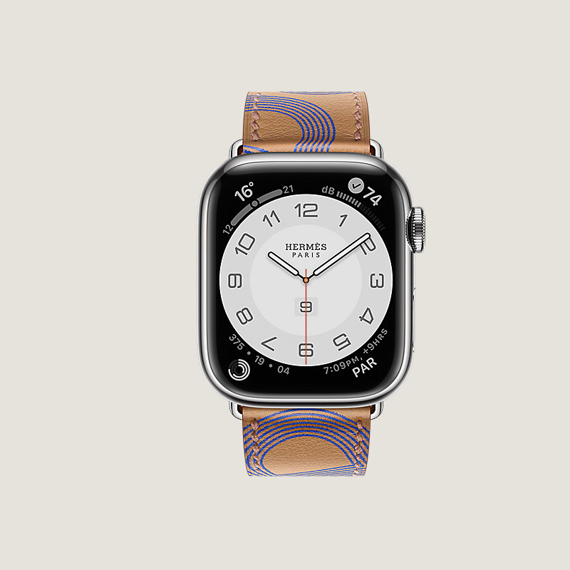 Boîtier Apple Watch Hermès Series 8 en acier inoxydable 41 mm & Bracelet simple tour en veau Swift coloris Biscuit/Bleu Électrique, imprimé « Circuit 24 »