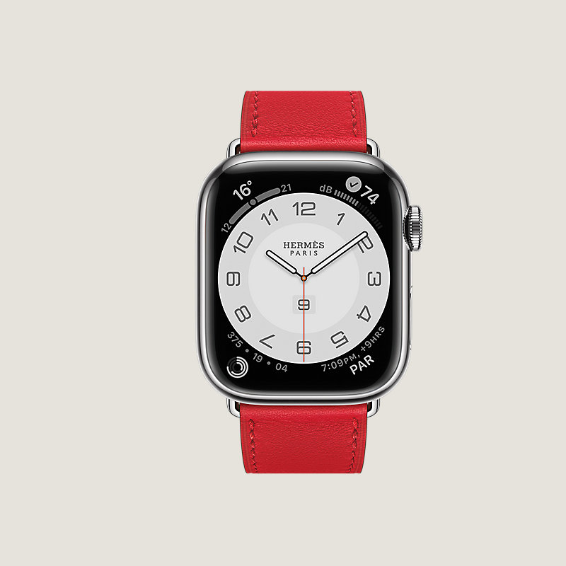Boîtier Apple Watch Hermès Series 8 en acier inoxydable 41 mm & Bracelet simple tour en veau Swift coloris Rouge de Cœur