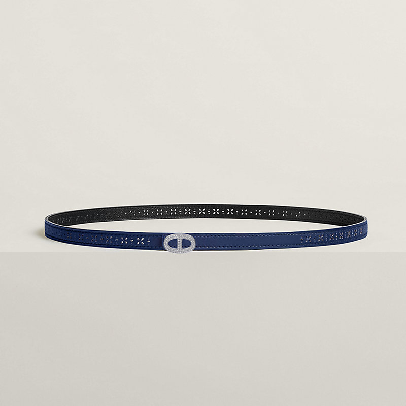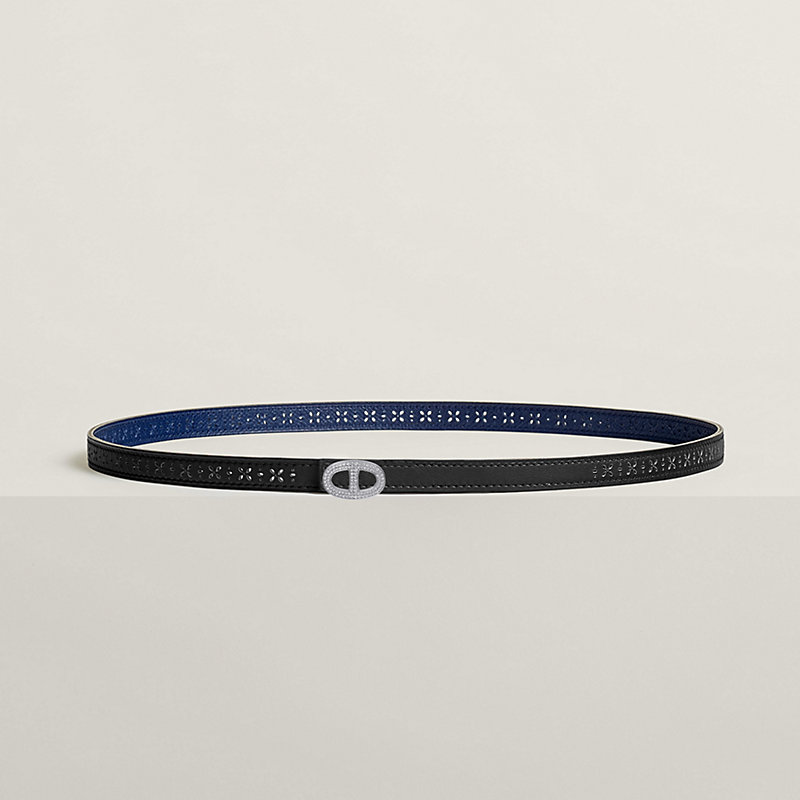 & Cuir de ceinture réversible en veau Swift et veau Epsom perforé. Avec ses fines perforations aux motifs floraux, le cuir gagne en légèreté et en fantaisie, et ses petits jours laisseront transparaître avec subtilité le tissu d'une robe ou d'un pantalon. Fabriqué en France