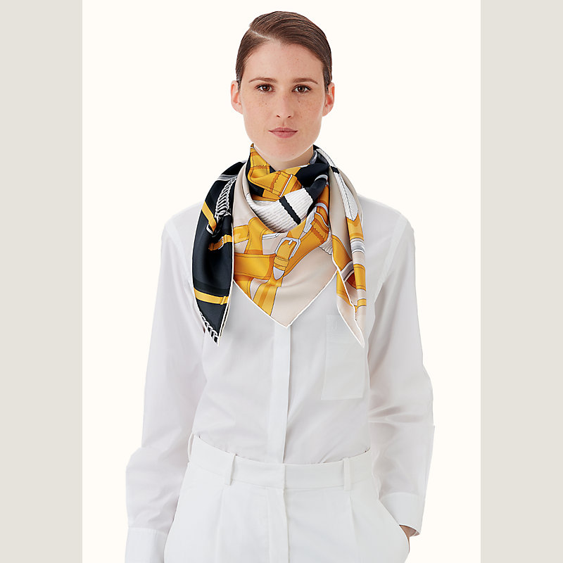 Accessoire intemporel du vestiaire Hermès, le carré 90 est un incontournable qui se porte aussi bien autour du cou, qu’en ceinture, en bandeau ou en turban.