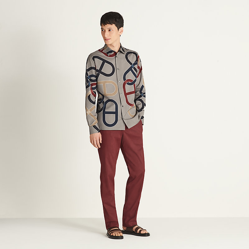 Chemise imprimée « Maillons Chaîne d'Ancre », coupe ajustée, col souple, boutons en pure nacre, poignets simples avec boutons « Clou de Selle » en palladium, coutures renforcées (7 points par cm) en coton faux Uni H (100 % coton)