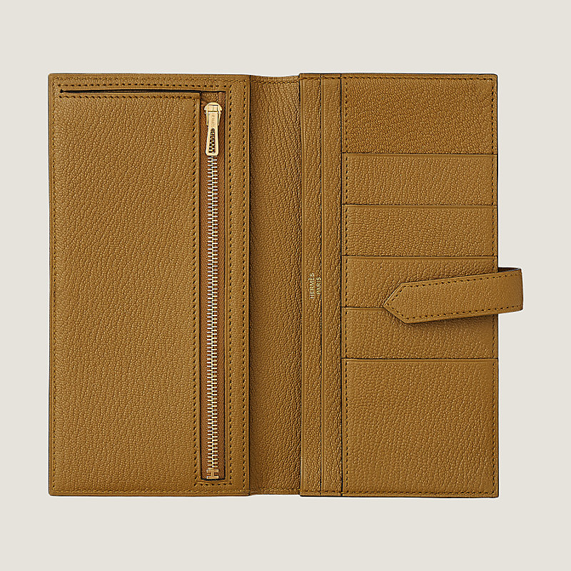 Portefeuille à soufflet en chèvre Mysore, doublé en agneau, fermé par une patte en cuir et un fermoir « H » plaqué or