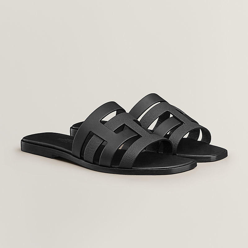 Deux initiales entrelacées sur ces sandales en veau et veau Epsom aux bords coupés franc