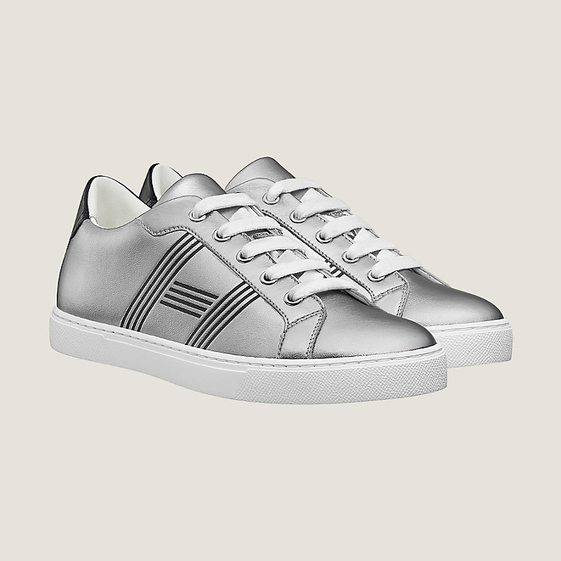 Tennis en nappa métallisé et veau épurées et graphiques. Jeux de rayures reliéfées contrastées.
