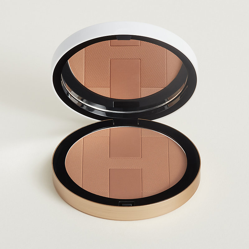 Com seu estojo redondo, esse disco luminoso branco e dourado projetado por Pierre Hardy se distingue por seu formato generoso. Sobre o pó compacto, listras finas que lembram o twill de seda surgem em filigrana e adornam o emblemático motivo H passant. Esta assinatura gráfica, com influências Art Déco, foi criada para o seleiro Hermès em meados dos anos 20. Além de ser estético, o H também é funcional e oferece três intensidades da mesma cor, sendo a faixa vertical a mais escura e o fundo, a mais clara.