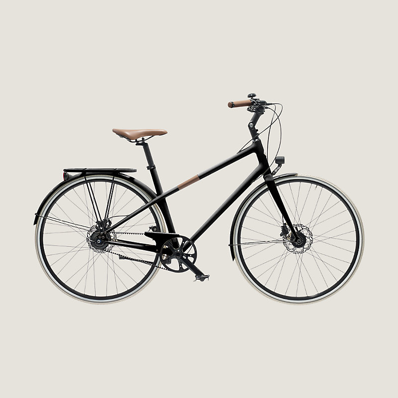 Bicicleta de lazer unissexo Hermes em carbono, cor de carbono. Versátil, excepcionalmente leve, durável e confortável. Couro taurilho liso em pontos de contato. 8 marchas.