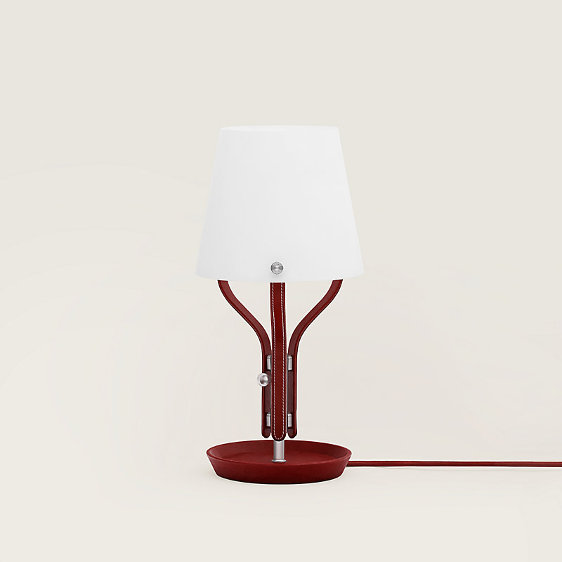 Luminária de cabeceira revestida em couro de touro liso, cúpula sustentada por três hastes em couro. Sustenta-se sobre uma base que também pode ser usada como porta-objetos. Iluminação difusa. Regulador para ajustar a intensidade da luz.