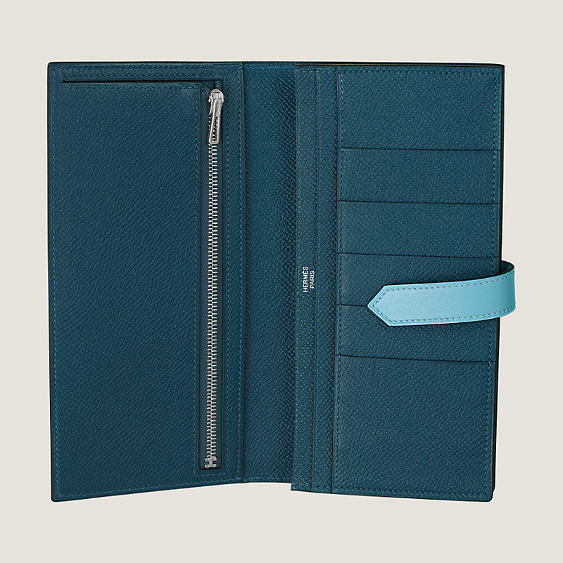 Hermes wallet with gusset in Epsom calfskin/Tadelakt calfskin and lined with lambskin, silver and palladium plated 'H' tab closure, 5 credit card slots, 4 additional pockets, change purse with zipper