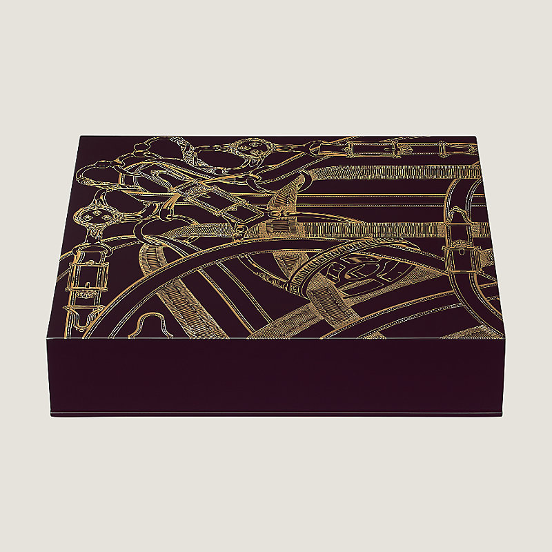 Hermes silk scarf box, "Cavalcadour" print, engraved hand lacquered wood