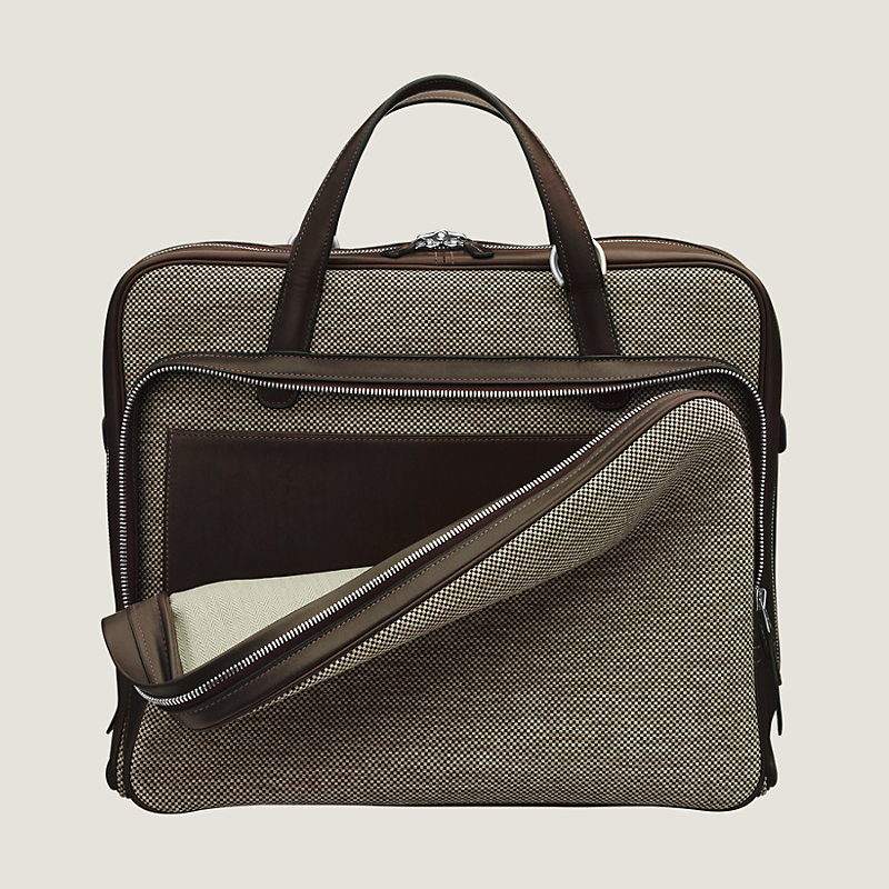 Messenger bag in water-resistant H Tech canvas and Barenia calfskin, brushed silver and palladium-plated hardware. Two zipped compartments: on the front, an applied pocket in barenia calfskin and a main compartment lined with chevron weave with a foam pocket to hold a computer of up to 13". Outer applied pocket on the back and leather flap system to attach the document holder.
