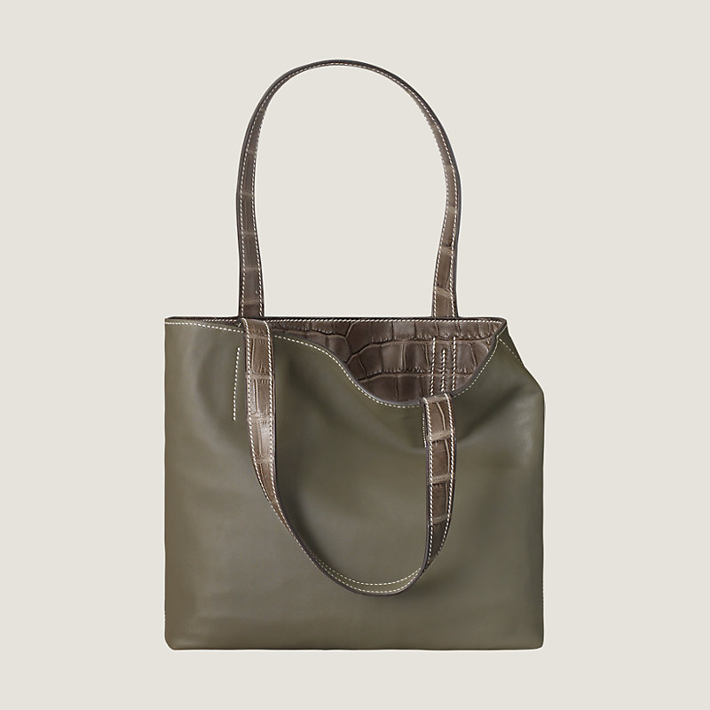 Hermes reversible tote in Chiffon Mississippiensis alligator leather, reversing to Sikkim calfskin, embossed with “Hermes Paris”