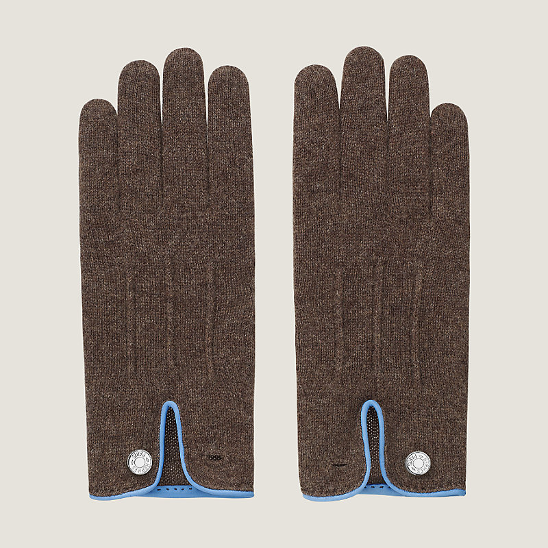 Hermes gloves in cashmere with glossed lambskin piping. Clou de Selle finishings in palladium plated metal