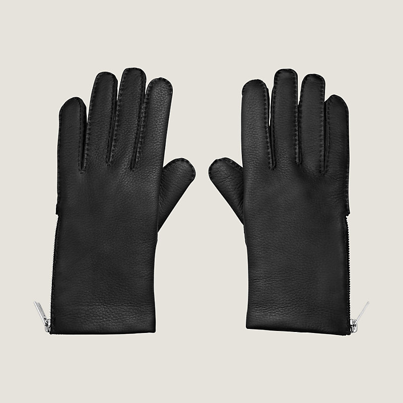 Hermes men's gloves in deerskin, cashmere lining. Finishings in palladium plated metal, hand-sewn.