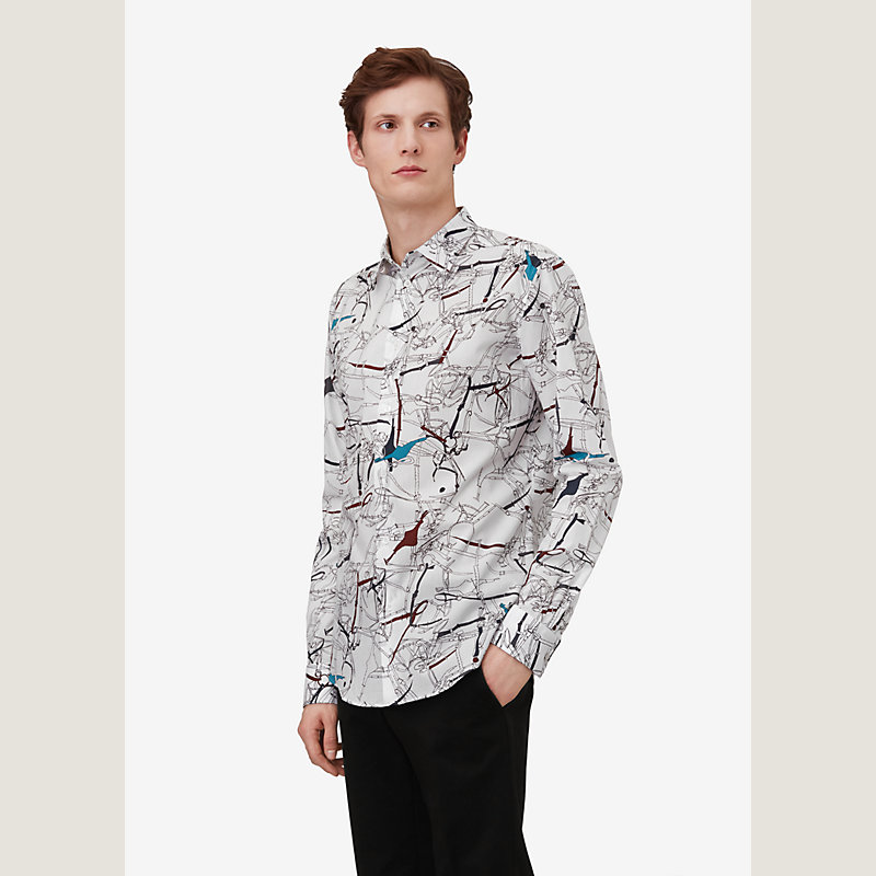 Hermes long sleeve button front fitted shirt in "Harnais et Filets" print, soft straight collar, plain cuffs with palladium plated buttons (100% cotton)