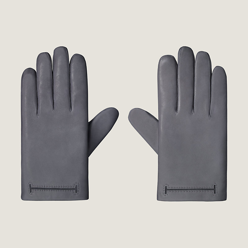 Hermes men's gloves in glossed lambskin with subtle H design and silk lining.