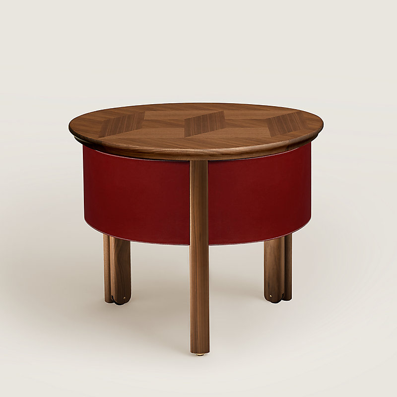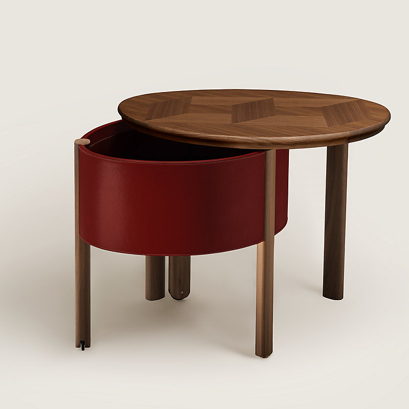Storage coffer with rotating lid in Canaletto walnut frame and Canaletto walnut marquetry top. Covered with smooth taurillon leather