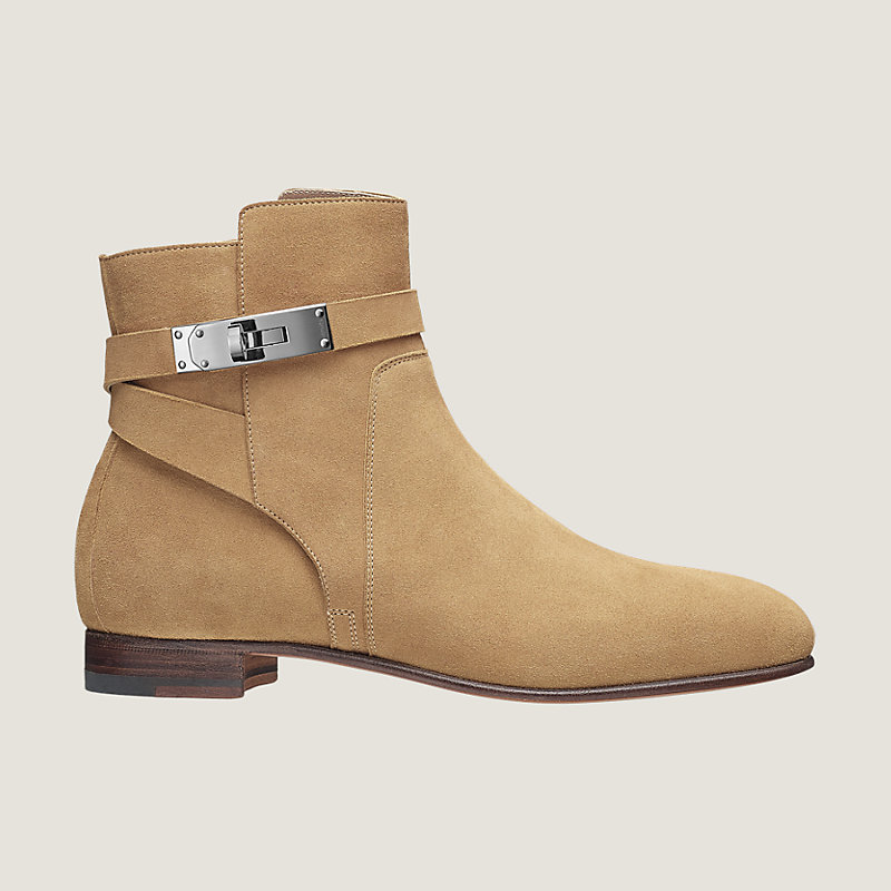Ankle boot in suede goatskin with iconic buckle and wrap-around ankle strap