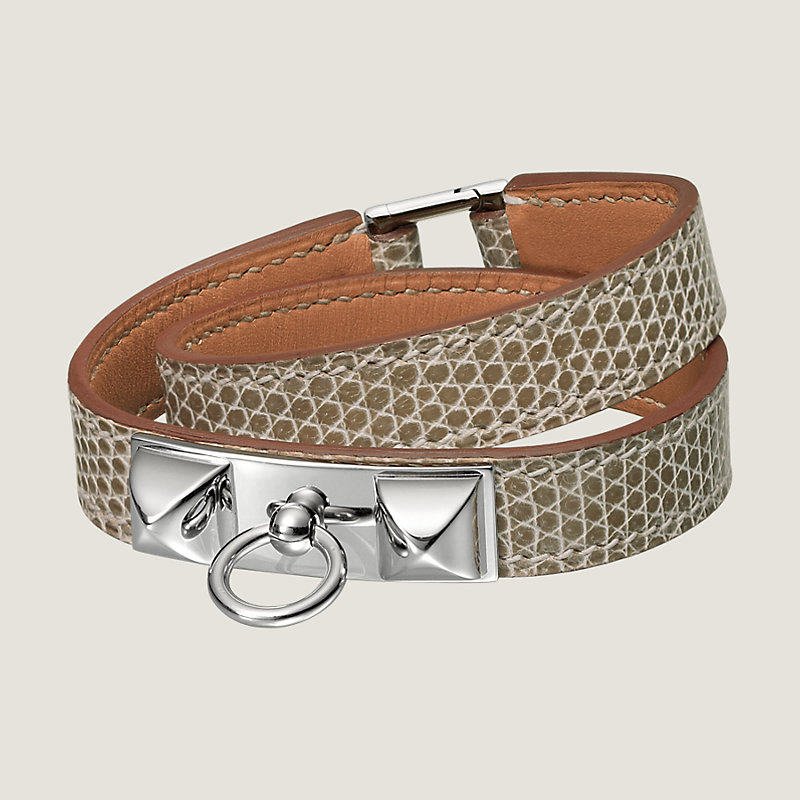 Double tour bracelet in smooth Niloticus lizard with palladium plated Medor pyramid studs and ring