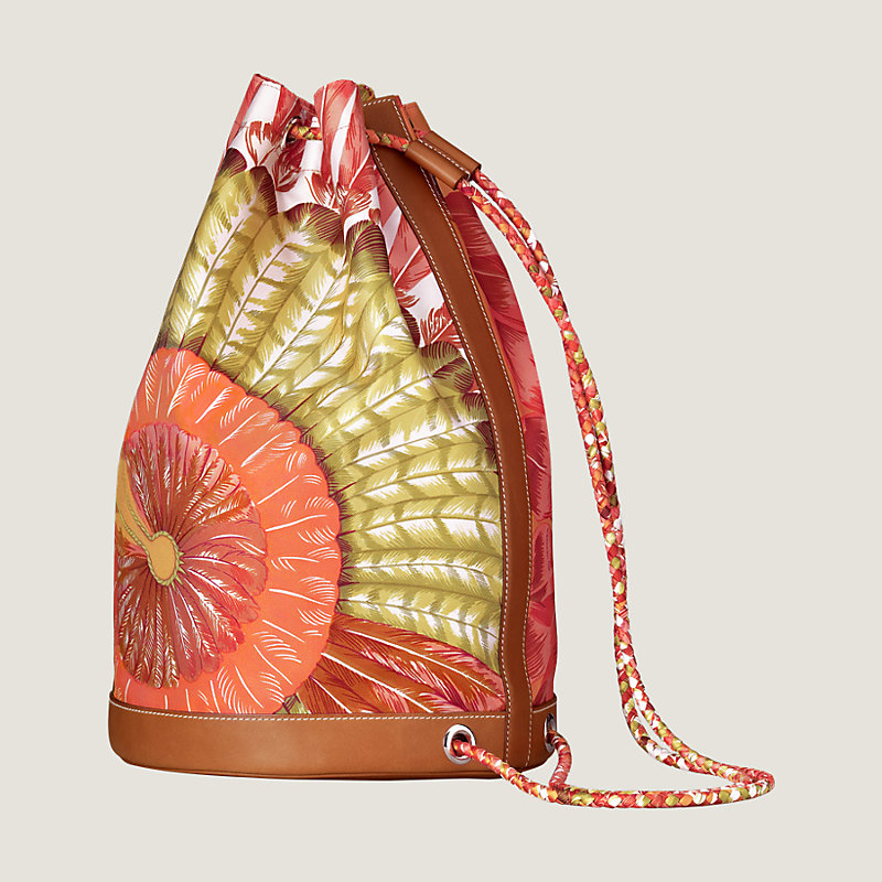 Hermes sport-chic bag in "Brazil" printed silk and Barenia calfskin. Woven silk strong shoulder and hand strap, palladium plated metal strap loops