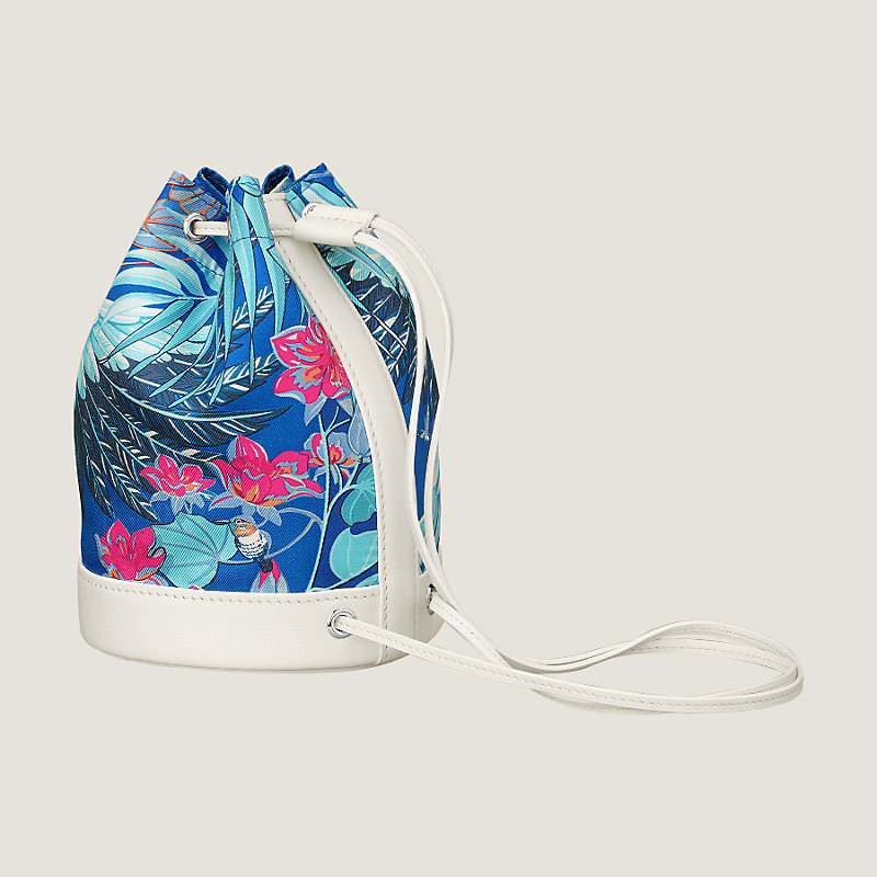 Hermes sport-chic bag in "Flamingo Party" printed silk and Swift calfskin. Woven silk strong shoulder strap