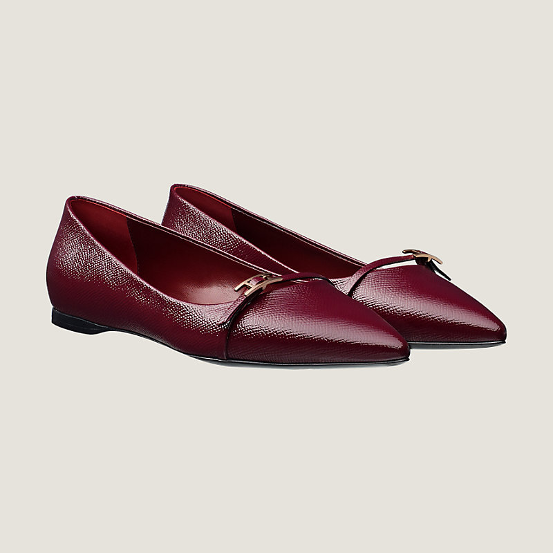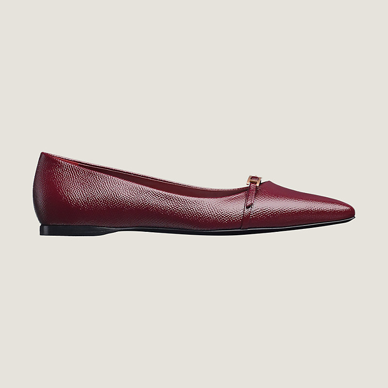 Ballerines bout pointu en veau Epsom verni, boucle « Hapi » finition or rose, semelle en cuir