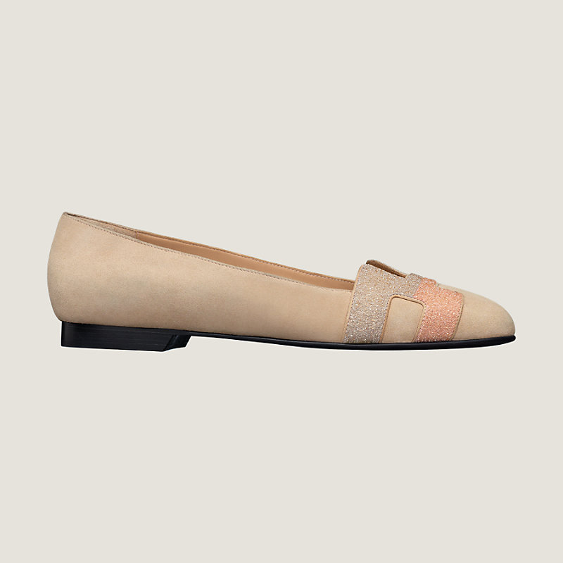 Ballerines en chèvre velours, découpe « H » en poudre de cristal, talon plat en lamelles de cuir