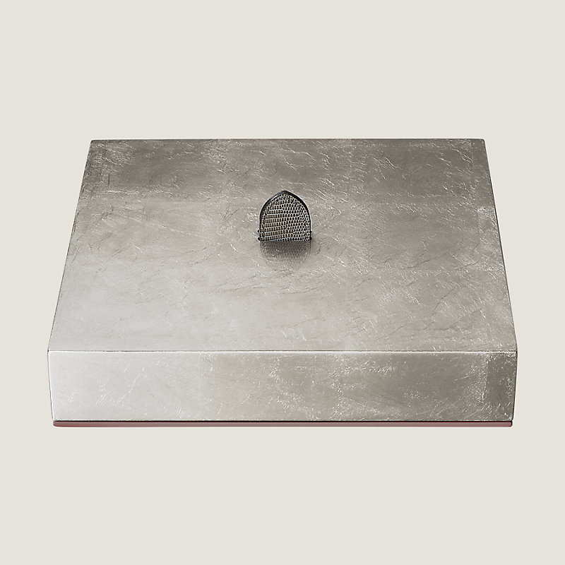 Boîte à carrés en bois laqué main et feuilles finition palladié laquées main, patte en lézard lisse