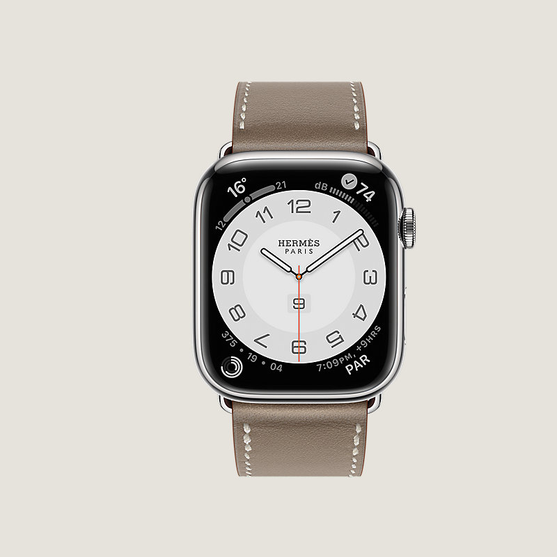 Boîtier Apple Watch Hermès Series 8 en acier inoxydable 45 mm & Bracelet simple tour en veau Swift coloris Étoupe