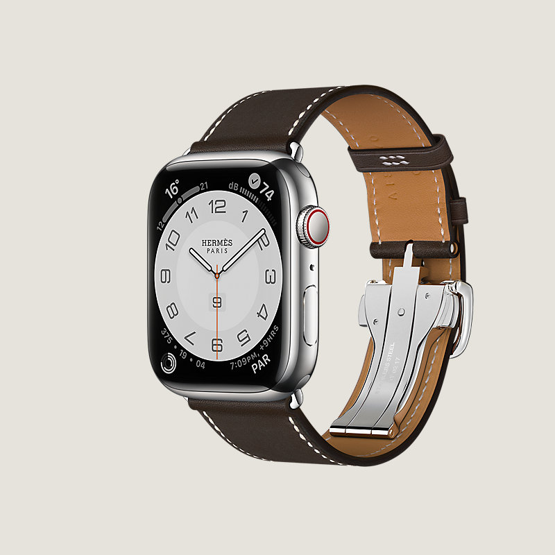 Boîtier Apple Watch Hermès Series 8 en acier inoxydable 45 mm & Bracelet simple tour boucle déployante en veau Barénia coloris Ébène