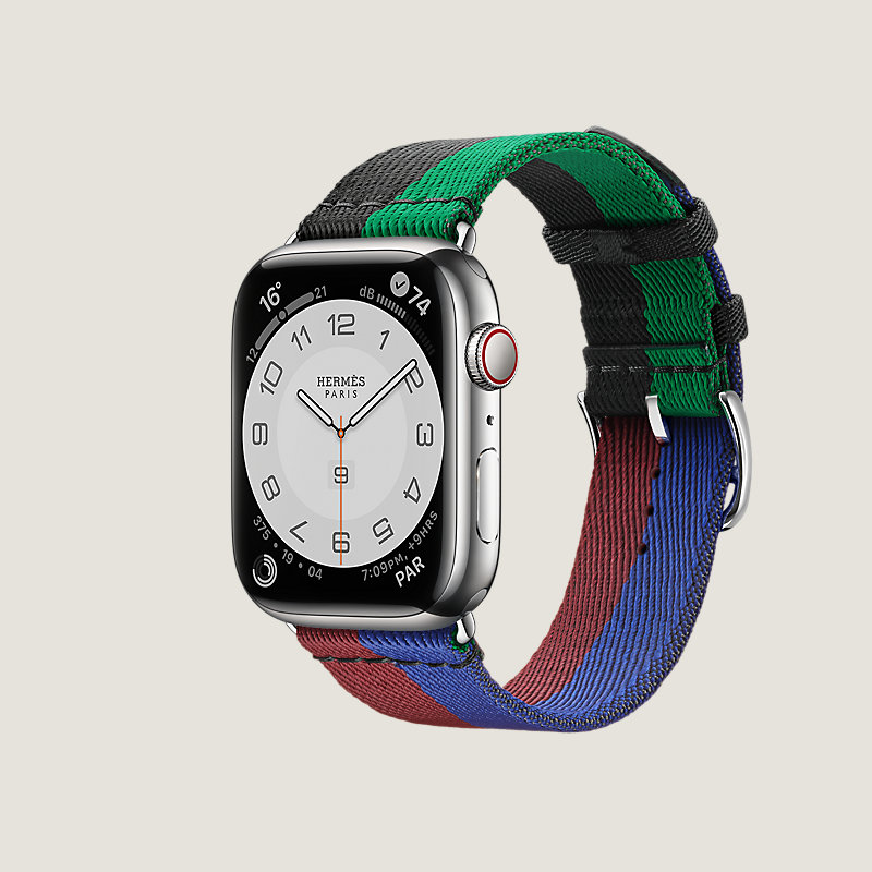 Ce bracelet inspiré des casaques des jockeys offre une allure colorée et sportive à votre Apple Watch Hermès.