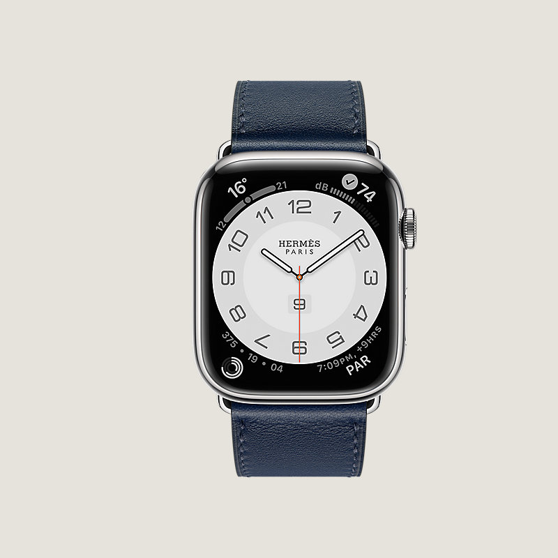 Boîtier Apple Watch Hermès Series 8 en acier inoxydable 45 mm & Bracelet simple tour en veau Swift coloris Navy