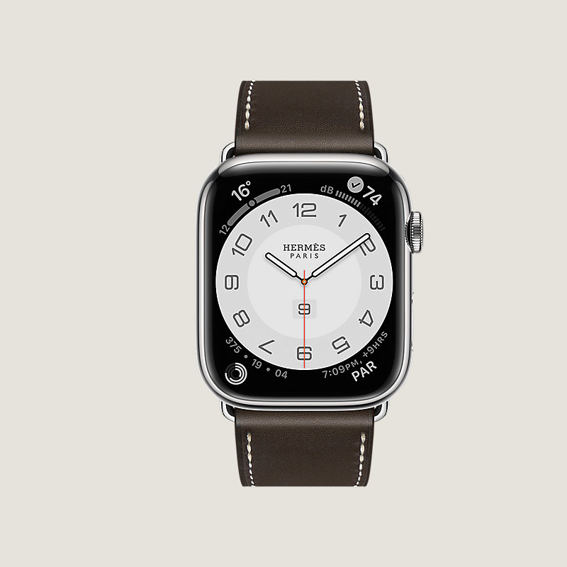 Boîtier Apple Watch Hermès Series 8 en acier inoxydable 45 mm & Bracelet simple tour boucle déployante en veau Barénia coloris Ébène