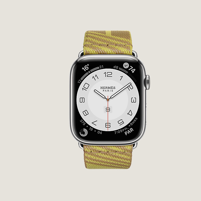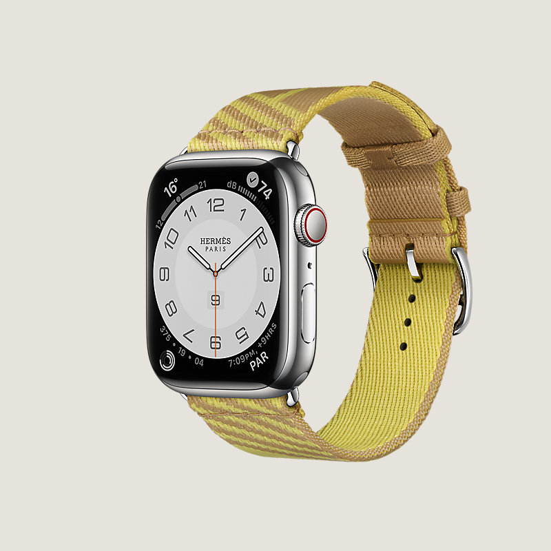 Boîtier Apple Watch Hermès Series 8 en acier inoxydable 45 mm & Bracelet simple tour en nylon tissé coloris Kraft/Lime, motif « H Vibration »