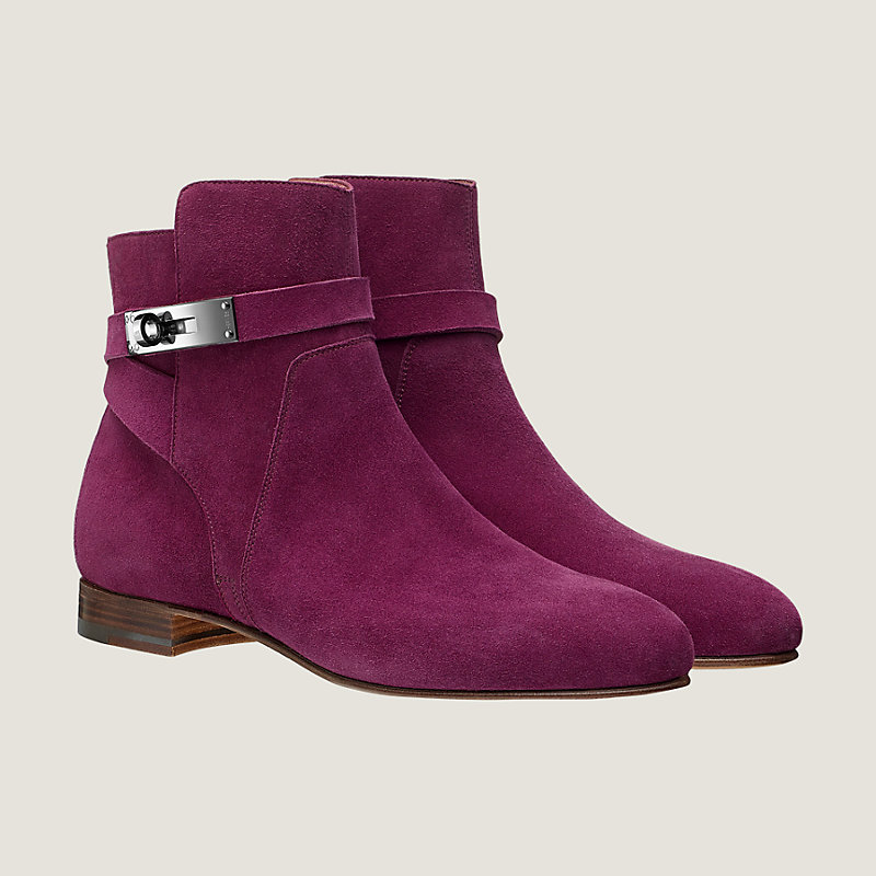 Bottines en chèvre velours, cheville enlacée d'une bride au fermoir emblématique de la Maison