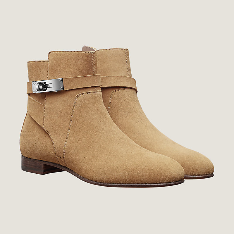 Bottines en chèvre velours, cheville enlacée d'une bride au fermoir emblématique de la Maison