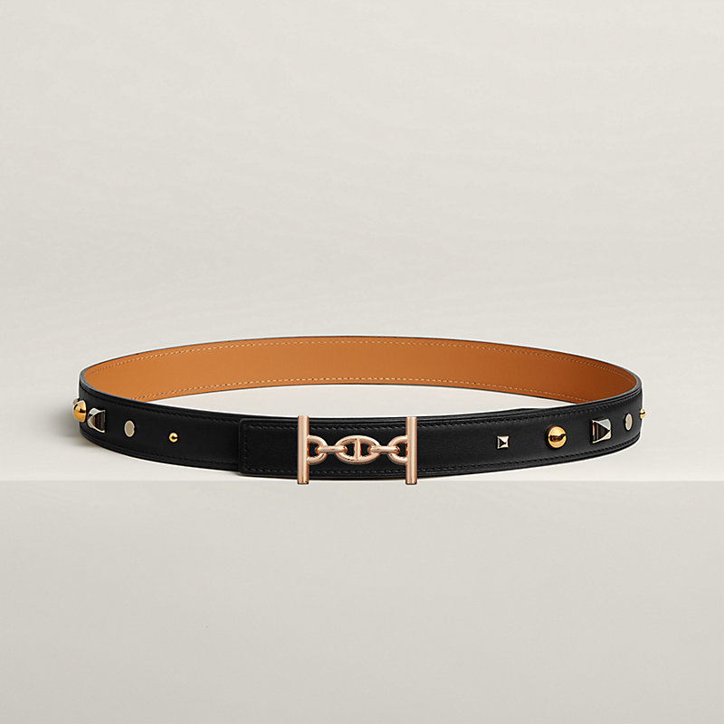 & Cuir de ceinture en veau Swift, parsemé de clous de selle, clous Médor et clous ronds. Cette constellation de clous en métal palladié et plaqué or apporte un esprit rock à ce modèle.