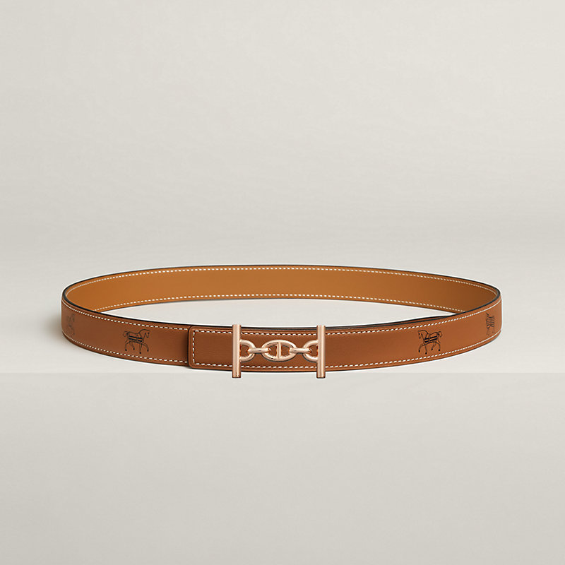& Cuir de ceinture en veau Swift imprimé « Couvertures et Tenues de Jour Semis ». La bande 24 s'imprime de couleur et de fantaisie grâce à la technique de la tampographie. Un motif ludique de chevaux noirs ou colorés pare la bande sur toute sa longueur. Fabriqué en France