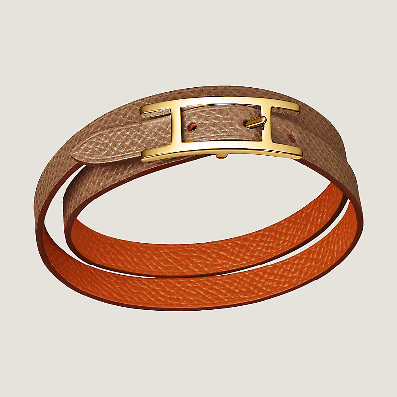 Bracelet double tour réversible en veau Swift et veau Epsom. Fermoir plaqué or